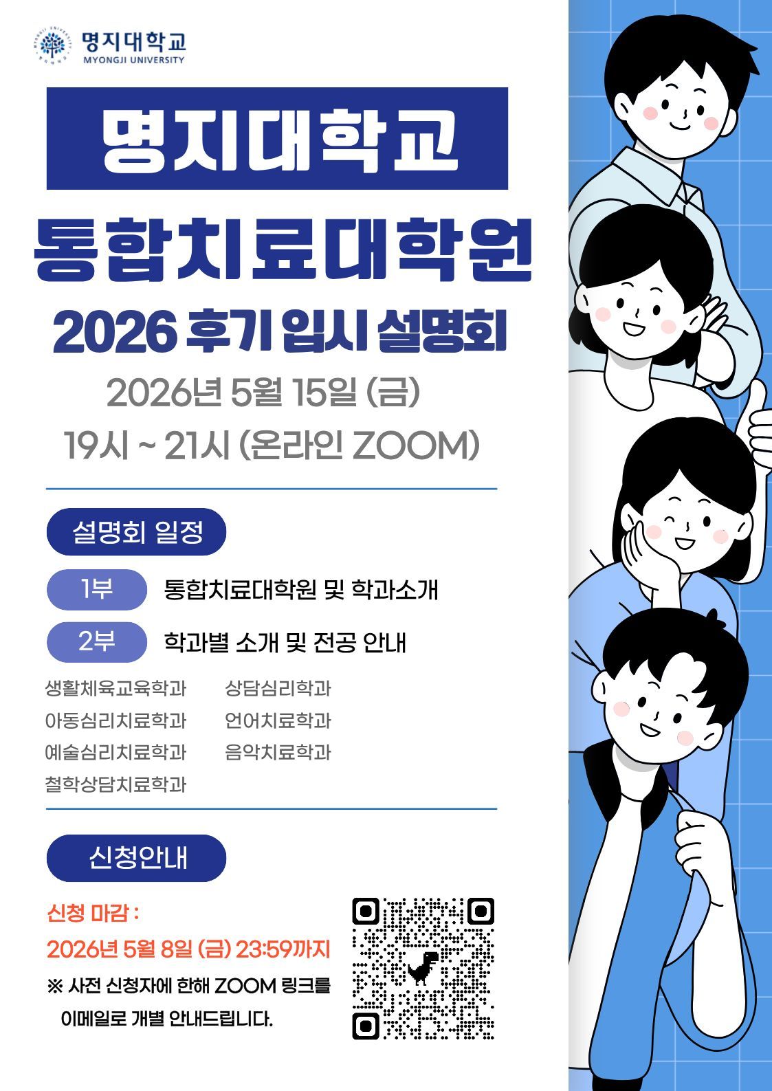 다음과 같이 2026년 후기 통합치료대학원 입시설명회 안내드리오니 많은 관심과 참여 부탁드립니다.